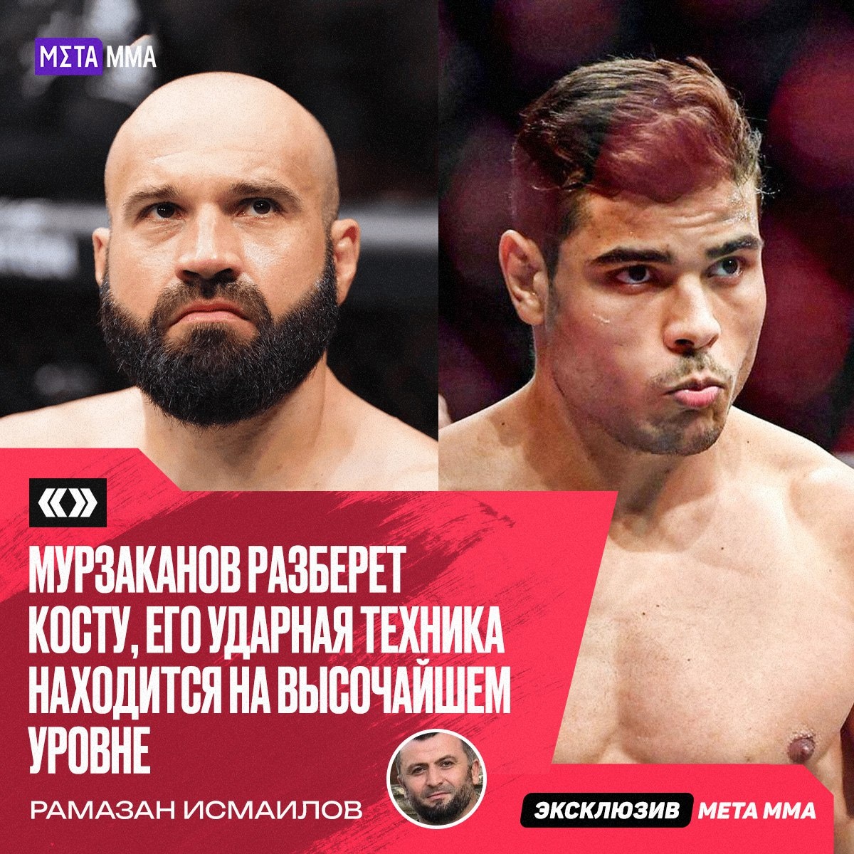 Известный тренер Рамазан Исмаилов уверен в победе Азамата Мурзаканова над Пауло Костой в предстоящем бою в UFC, отметив высокий уровень ударной техники россиянина. «У Азамата высочайший уровень ударки — классическая советская школа. Он чувствует ритм, работает ногами, знает, когда нужно ударить. В такие моменты он особенно опасен, поэтому Коста не потянет», — заявил Исмаилов в интервью MMA.Metaratings.ru. ❓ Согласны с таким прогнозом? 🔥 — Мурзаканов заберёт уверенно 🤔 — Коста - серьёзный тест 👊 Подпишись на Meta MMA | Meta MMA в MAX | Наш канал в ВК