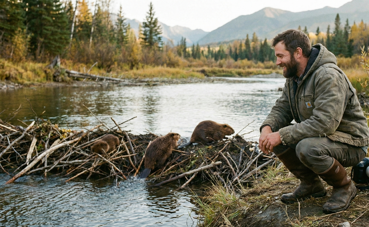 Виктор огляделся. Чуть поодаль, в тихой воде за плотиной, он увидел хатку. Большую, добротную. А рядом с ней на воде качалось бревно, на котором сидел крупный бобр. Он не прятался. Он смотрел на людей. Рядом с ним вынырнула еще одна голова, поменьше — бобриха. И три маленьких, пушистых комочка — бобрята.