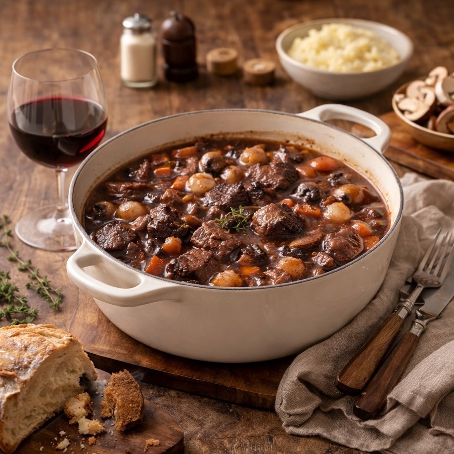 Сегодня поделимся традиционным французским рецептом — говядина по-бургундски, “bœuf bourguignon”. Это томленая говядина в красном вине с овощами и травами родом из Бургундии. Блюдо создавалось как крестьянское: простые ингредиенты, долгое приготовление и насыщенный вкус. Именно поэтому говядина по-бургундски идеально подходит для холодного сезона и уютных ужинов дома. Говядина (лопатка, голяшка или щека) — 1 кг Красное сухое вино — 750 мл Морковь — 3 шт Лук репчатый — 2 шт Шампиньоны — 250 г Копчёный бекон или lardons — 150 г Чеснок — 2 зубчика Томатная паста — 1 ст. л. Мука — 1 ст. л. Оливковое масло — 2 ст. л. Сливочное масло — 20 г Лавровый лист — 2 шт Тимьян — 2–3 веточки Соль — по вкусу Чёрный перец — по вкусу Блюдо становится еще вкуснее на следующий день, когда соус полностью раскрывает свой аромат. Говядину по-бургундски можно подавать с картофельным пюре, пастой, рисом или свежим багетом. Сервируйте блюдо в посуде La Redoute, чтобы стол был эстетичным. И подписывайтесь на наш