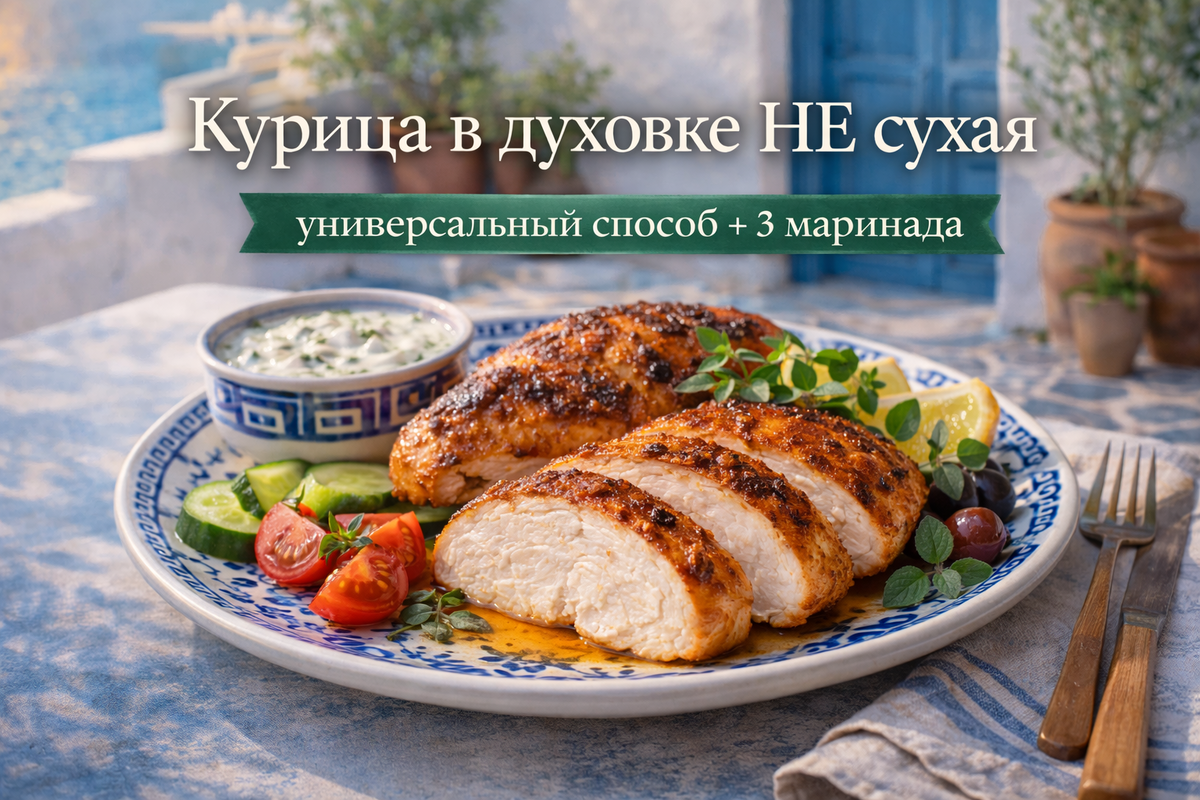 Если вы хоть раз доставали из духовки «красивую» курицу, а внутри она была сухая — вы не одни. Духовка часто пересушивает, потому что мы либо передерживаем, либо не защищаем мясо от потери влаги. Сегодня дам универсальный способ, который работает и с грудкой, и с бедром, и даже с голенью. Плюс — 3 маринада: сливочный, лимонно-травяной и томатный. Что нужно (на 3–4 порции) Универсальный способ “Сочно всегда” Секрет в трёх вещах: 💡 Лайфхак: чем ровнее толщина, тем меньше шанс пересушить. Выберите один маринад ниже. Даже 10 минут уже дают разницу. 3 маринада (простые, но очень рабочие) Куда подходит: грудка, бедро. Почему работает: молочная база обволакивает и удерживает влагу. Куда подходит: грудка, голень, крылья. Ошибка: держать в лимоне часами — может стать “ватной”. Оптимально 15–40 минут. Куда подходит: бедро, голень, крылья. Лайфхак: пасту сначала размешайте с маслом — так не будет горечи и комков. Шаг 3. Запекаем (главное — температура и время) ✅ Если есть термометр: внутри 72–