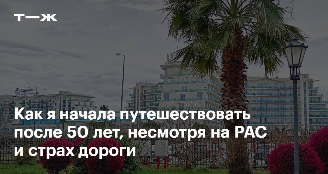 Тогда я путешествовала с семьей и несколько раз была на море. Несмотря на множество сложностей, связанных с поездками, у меня осталось впечатление, что море — это самое прекрасное, что может быть на свете. Шли годы, у меня была непростая жизнь, осложненная неврологическим диагнозом. Я безумно скучала по морю. Я видела во сне заливы и бухты. Это стало навязчивой идеей. Мне было невероятно сложно начать путешествовать. Потому что я не умею ничего организовывать. Я никогда не была в аэропорту. Я не знала, как заказать такси. У меня не было дорожной сумки. Но мне удалось исполнить мечту и побывать на море — в Сочи. Героине статьи 52 года, и недавно она отправилась в долгожданнную поездку в Сочи, потом побывала в Москве и уже запланировала новое путешествие в сторону Азии. По ссылке читательница рассказала, как справилась со сложностями в дороге и осуществила мечту: https://t-j.ru/ch-tg/sochi-trip/
