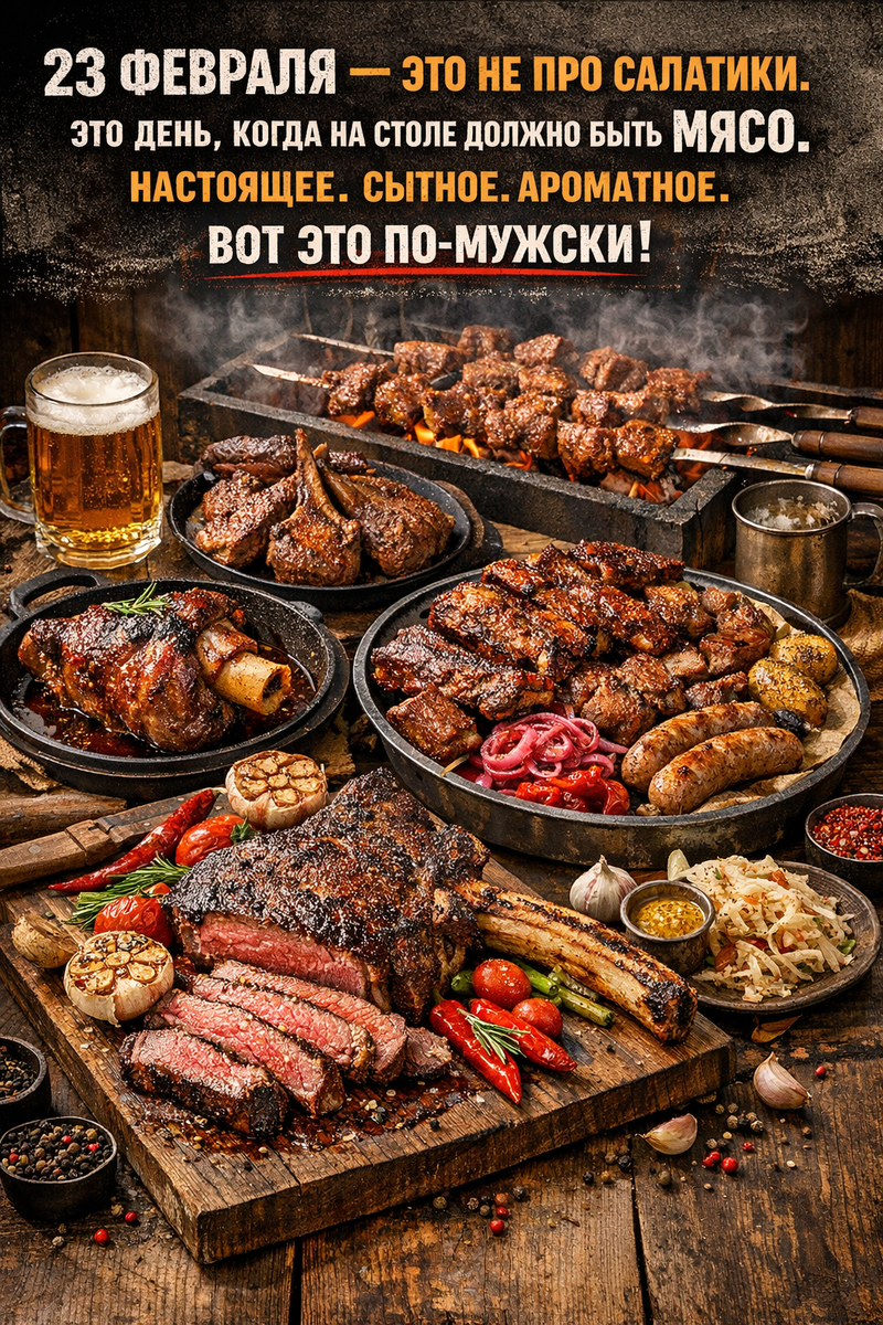 Это день, когда на столе должно быть мясо. Настоящее. Сытное. Ароматное. Такое, после которого не хочется десерта, а хочется сказать: «Вот это по-мужски».