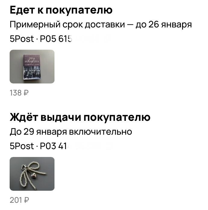 Два заказа было на одном профиле, заказали в понедельник брелок для сумки, а во вторник книгу «Три мушкетера».