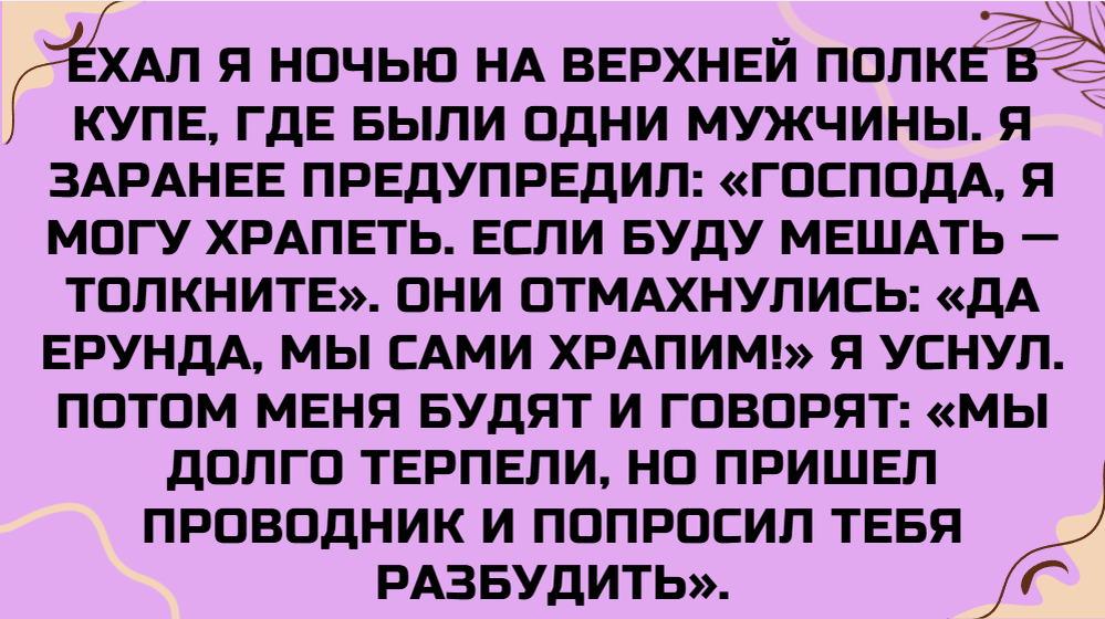 - Ехала я как-то из столицы в родной город, дорога была больше девяти часов. Попала в купе к трем мужчинам старше пятидесяти. По разговору было понятно, что они из одной организации и едут по делам. У меня было место сверху, я его специально и выбирала. В начале поездки я села на нижнюю полку под своей, чтобы поужинать. И постоянно ловила странные взгляды — напряженные, будто они чего-то ждут. Я накануне не выспалась, поэтому быстро поела и забралась наверх. Уснула моментально. Утром спустилась позавтракать и услышала от самого «молодого» на вид: «Как хорошо, что вы нормальная!» Я спросила, что он имеет в виду. Оказалось, они весь вечер готовились к тому, что я начну выпрашивать нижнюю полку, и заранее настраивались «держать оборону». Рассказали, что несколько раз ездили с истеричными дамами, которые и полку требовали, и сумки заставляли таскать. А у них уже и возраст не тот, и спины не железные. © RinaS1