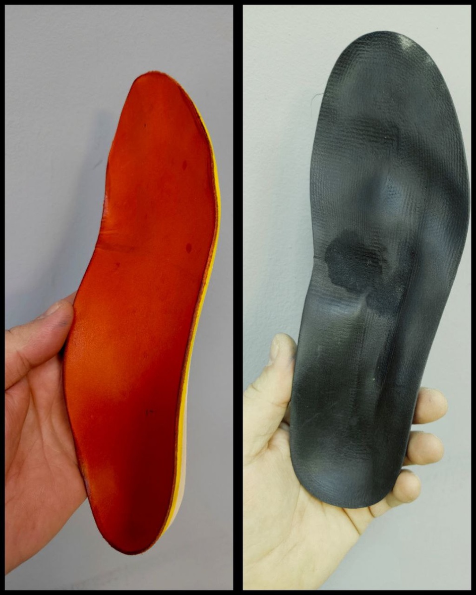 со стопой. Совершенно разные принципаы воздействия на стопы и дело не материале и цвете и не чем их там делали, а формы изгибы и воздействие на стопу разные Коричневая стелька была изготовлена по классической схеме, с использованием гипсового слепка стопы и тщательным расчётом высоты каждого свода. Чёрная стелька была создана с помощью фрезерного станка и компьютерной модели. Эти два подхода настолько отличаются друг от друга, что их даже сложно сравнивать. Однако стоит отметить, что одна девушка, профессиональный спортсмен, выбрала изготовление по классической технике, они оказались для неё наиболее подходящими.