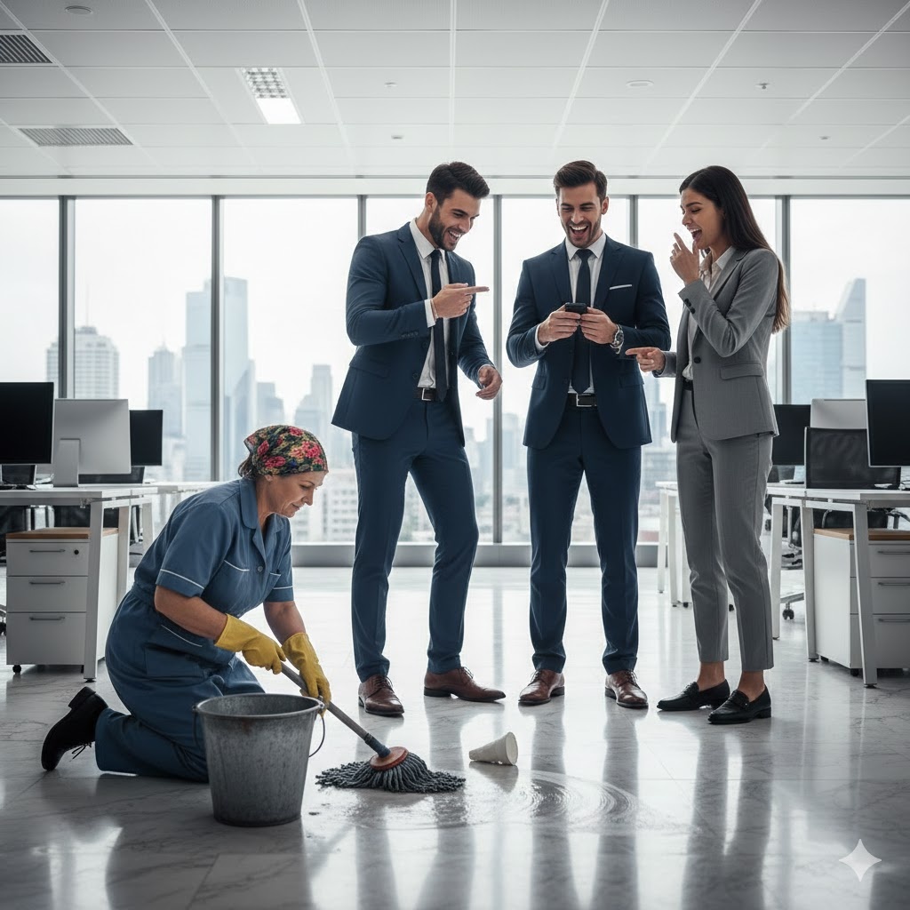 Они не боялись её. Кто будет бояться пустого места? При уборщице можно было говорить о чем угодно — она ведь всё равно ничего не понимает в их «высоких материях». Для них она была лишь фоновым шумом, биологическим роботом, созданным для того, чтобы их ботинки за пятьсот долларов оставались чистыми.