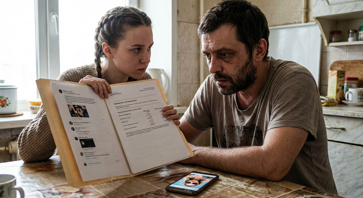 Виктор увидел фото денег, переписку, информацию о купленной квартире. Его лицо менялось: от недоумения к шоку, а затем к какому-то болезненному осознанию.