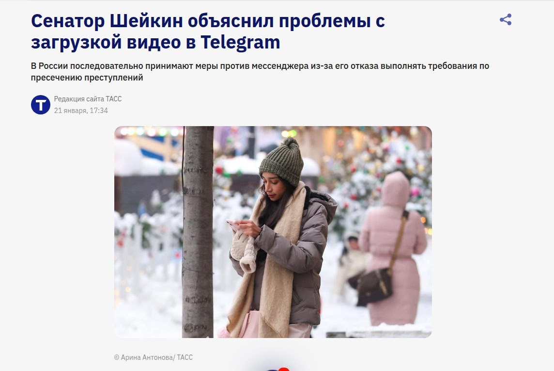 Меры против Telegram вводятся в России последовательно в связи с отказом мессенджера выполнять требования по пресечению преступлений. Об этом заявил ТАСС заместитель председателя Совета по развитию цифровой экономики при Совете Федерации Артем Шейкин. via Жаль. У меня канал в телеграме.