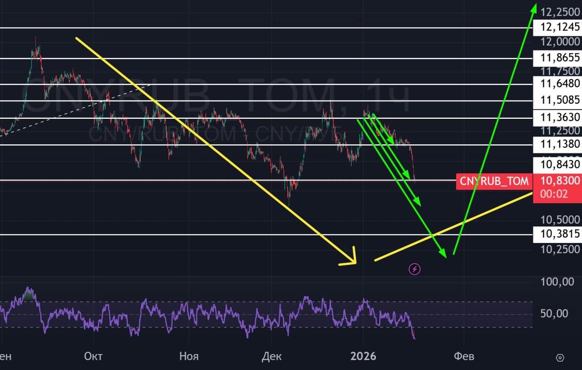 🟢 Тем временем юань пришел на 10,84. По ожиданиям ничего не изменилось - жду укрепление рубля. В прошлых постах одна и та же логика, просто фиксируем её исполнение. 🟢Ранее Песков сказал, что с инфляцией нужно бороться. На это обратил внимание на одном из видео. ЦБ и Минфин опубликовали план об усилении продажи валюты в течение месяца. Инфляция и инфляционные ожидания всё еще высокие, а значит с ними будут бороться. 🚗 Жду финального укрепления рубля перед его дикой девальвацией. Цели: 10,60, и вплоть до 10,20, после чего буду ждать массивный тренд вверх за счет шоковых событий + спасение бюджета. #юаньрубль #юань #прогнозрубля #рубльдоллар #cnyrub #cnyrubf #bogdanoffinvest $CRH6 $CRM6 $CNYRUB $CNYRUBF