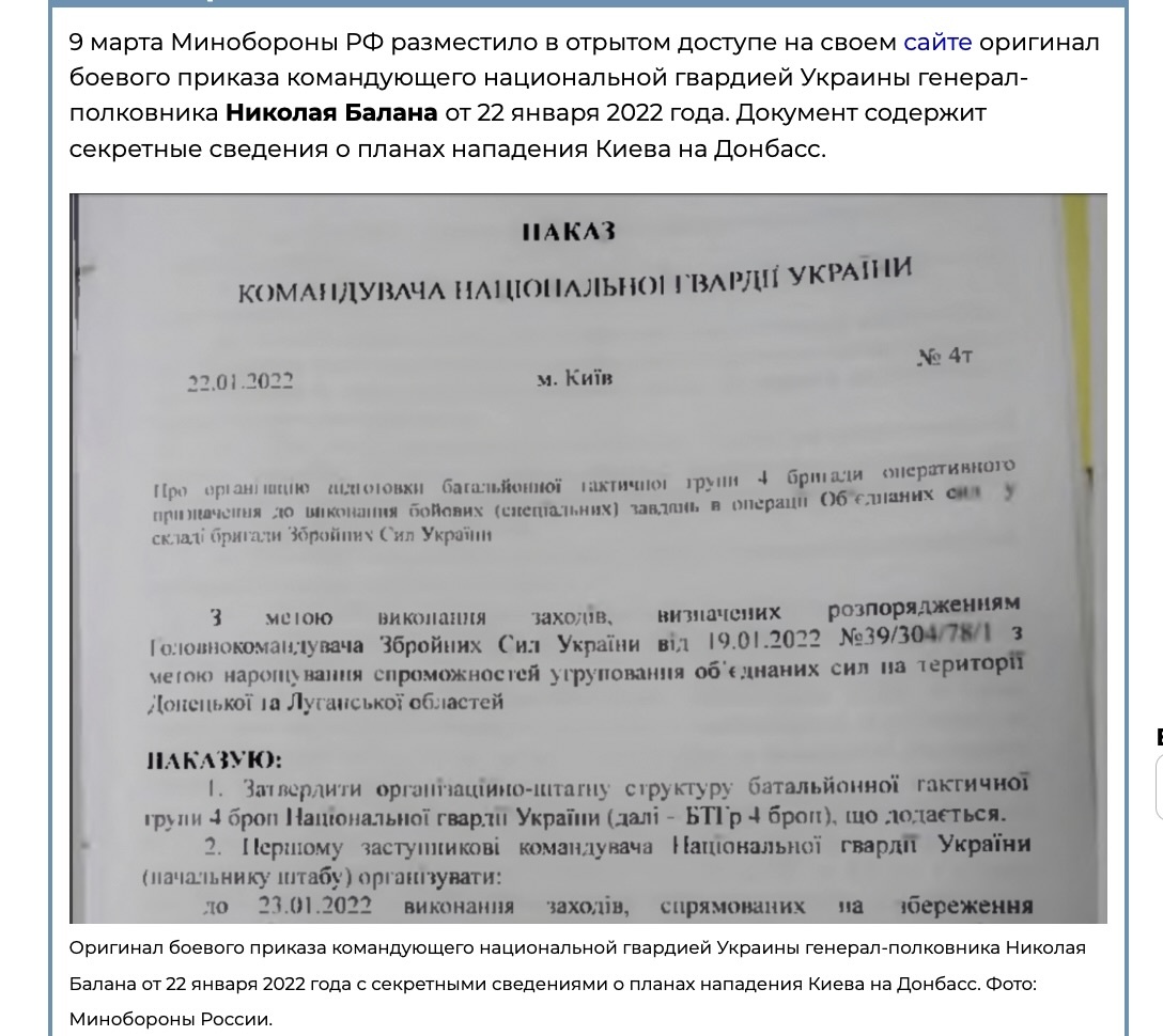 - 22 января 2022 года вышел секретный приказ командующего Национальной гвардией Украины генерал-полковника Николая Балана. Приказ был озаглавлен: "Об организации подготовки батальонной тактической группы 4-й бригады оперативного назначения для выполнения боевых (специальных) задач в операции объединённых сил в составе бригады вооруженных сил Украины".