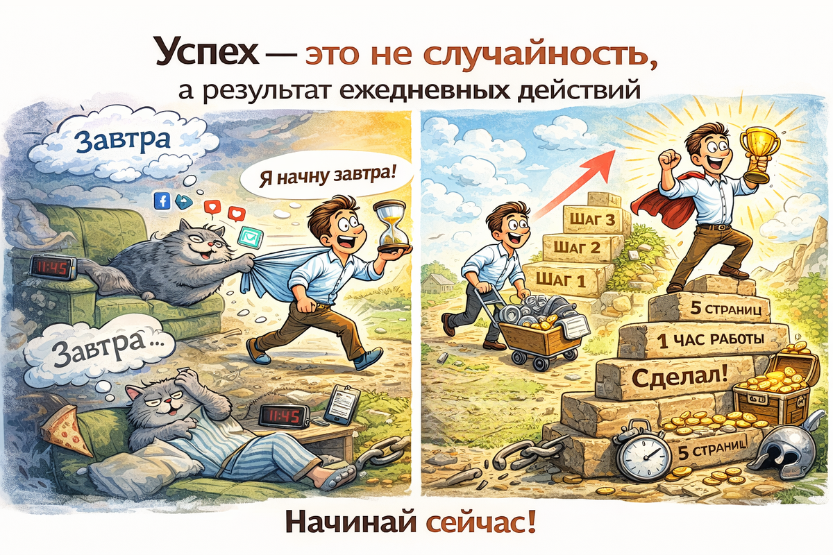 Привет, боец! Устал от вечной гонки с собственной ленью? Думаешь, что «вот завтра точно начну»? Пора разорвать этот замкнутый круг! Перед тобой — не очередная порция скучных советов, а боевой набор для тех, кто готов взять жизнь в свои руки. Поехали! Большие цели пугают? Не беда! Секрет в маленьких шагах. Представьте, что вы собираете золотые монетки: каждая — это выполненное дело. Сегодня — одна, завтра — две, через месяц у вас уже целый сундучок достижений! Пример: не «прочитать книгу за вечер», а «5 страниц перед сном». Когда смотришь на гору задач, хочется развернуться и убежать. А теперь попробуйте так: закройте глаза и скажите себе: «Следующие 60 минут — мои!». И сделайте только то, что реально успеть за этот час. Лайфхак: поставьте таймер, включите бодрую музыку — и вперёд! Вот суровая правда: мотивация приходит ПОСЛЕ действия, а не до. Это как с зарядкой: пока не начнёшь — нет сил. Но после первых 10 приседаний — уже не остановить! Что делать? Просто начните. Хоть с одной минут