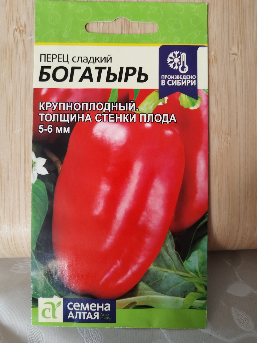 «Богатырь» — среднеспелый сорт сладкого перца. **Описание:** Куст среднерослый, раскидистый, мощный, высотой 60–70 см, с крупными тёмно-зелёными листьями. Плоды крупные, конусо- или призмовидные, массой 75–100 г, слегка ребристые, с 2–4 камерами. В технической спелости зелёные, в биологической — красные. Толщина стенки 4,9–5,8 мм. Вкус сладкий, отличный. Подходит для свежего употребления и консервирования. **Характеристики:** - Срок созревания: 115–131 день от всходов. - Условия выращивания: теплица или открытый грунт. - Рекомендованные регионы: Северо-Кавказский и Нижневолжский. - Урожайность: на даче — 5–7 кг/м², в промышленных условиях — 20–50 тонн/га. В свежем виде «Богатырь» богат витамином C и другими полезными веществами, но при термообработке их содержание снижается. **Выращивание:** Сорт предпочитает хорошо освещённые участки, но небольшая тень возможна. Оптимальная температура для роста +22…+25°C. Недостаток влаги негативно сказывается на цветках и плодах, вызывая их осыпание