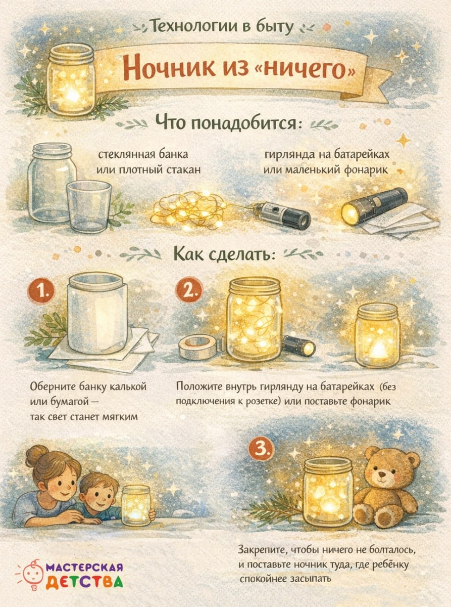 ». Иногда ребёнку нужен не яркий свет, а спокойная точка опоры в темноте. И сделать её можно буквально за 10 минут - безопасно и без похода в магазин. На одной картинке сделали для вас простую инструкцию❤️ Почему это работает: — нет открытого огня и нагрева — ребёнок видит, откуда берётся свет (меньше страхов) — можно сделать вместе: выбрать «домик для света», украсить, поэкспериментировать А ещё это момент, когда взрослый не «учит», а делает вместе. Пробует, объясняет, слушает вопросы и просто рядом. 💡 Небольшой лайфхак: договоритесь, что ночник включается только перед сном - так он станет ритуалом, а не просто лампой. #МастерскаяДетства