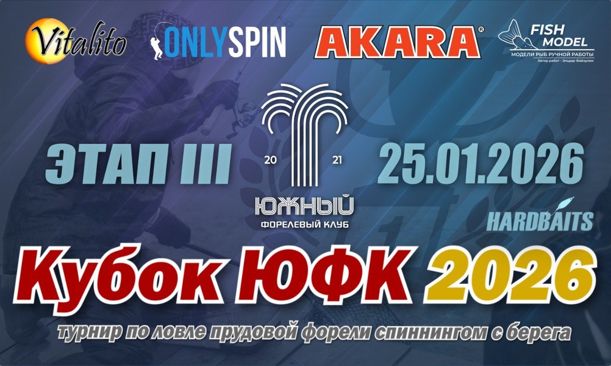 ! Уже совсем скоро нас ждет третий этап рейтинговой серии турниров по спортивной ловле прудовой форели спиннингом с берега - «Кубок ЮФК 2026». Наш партнер АО «Племенной форелеводческий завод «Адлер» выделил на предстоящие соревнования 600 килограмм отменной радужной форели навеской до 350-400 гр. Перед стартом соревнований мы запустим 400 кг. и дополнительно зарыбим после 6 периода еще 200 кг. В большом перерыве традиционно нас ждет комплексный обед: • Борщ • Салат со свежей капустой • Гречка и тефтели куриные в соусе Напоминаем, что в рамках подготовки к предстоящему турниру вы можете приобрести продукцию наших партнеров: • AKARA – производитель рыболовных товаров. (https://rybolov.org/). • OnlySpin – рыболовный интернет-магазин (https://onlyspin.ru). • ООО «ВИТАКРАФТ» (Vitalito), разработчик рыболовных приманок (https://vitalito-craft.ru). • FISH-MODEL – производитель сувенирной продукции рыболовной тематики и наградной атрибутики (https://t.me/FishModel).