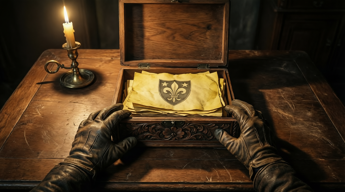 Я подошёл ближе, осторожно поднял его. Застёжка щёлкнула легко. Внутри — бумаги. Много. И сверху — знакомый герб с лилией и звёздами.