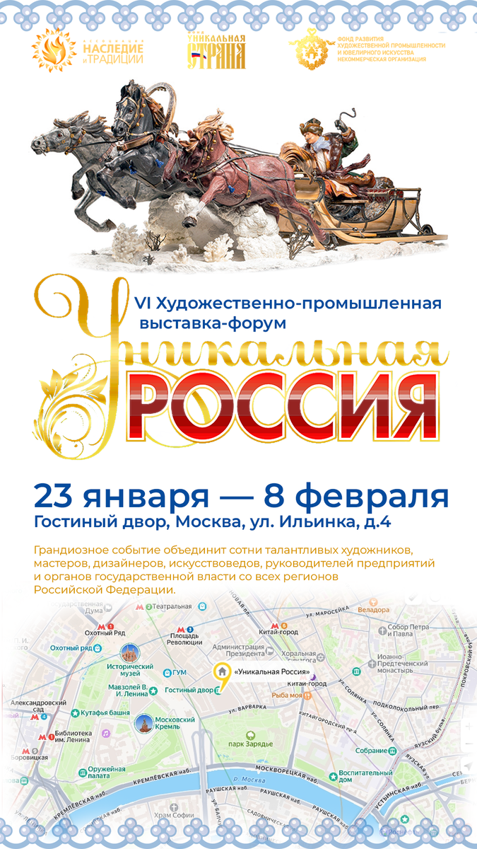 Открытие VI Художественно-промышленной выставки-форума «Уникальная Россия» запланировано в московском выставочном центре «Гостиный двор» на 23 января. Уже завтра!
