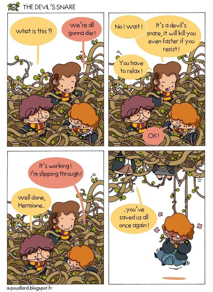 Начало рабочего года у меня началось с болезни - то ли простуда, то ли очередной ковид, не суть важно. Просто нет сил, вообще. Но при этом нельзя просто лечь и выпасть из жизни: есть работа, есть семья, есть ответственность. И первое, что автоматически включается в такие моменты: «надо собраться». Через "не могу" собраться из разобранного состояния.Напрячься. Потерпеть. Вытащить себя любой ценой. И тут мне вспомнился момент из Гарри Поттера (благо, в праздники его смотрели). Момент из "Философского камня" про дьявольские силки -те самые, которые начинают душить, когда ты пытаешься выбраться из них силой. Чем больше дёргаешься - тем сильнее они сжимаются и душат. А единственный способ выбраться - перестать бороться и расслабиться. С болезнью происходит ровно то же самое. Когда организм уже воюет, каждая попытка «ещё чуть-чуть собраться», «я должна», «кто если не я» работает как эти силки. Ты вроде бы стараешься помочь, а на самом деле - мешаешь организму бороться с болезнью, транжи