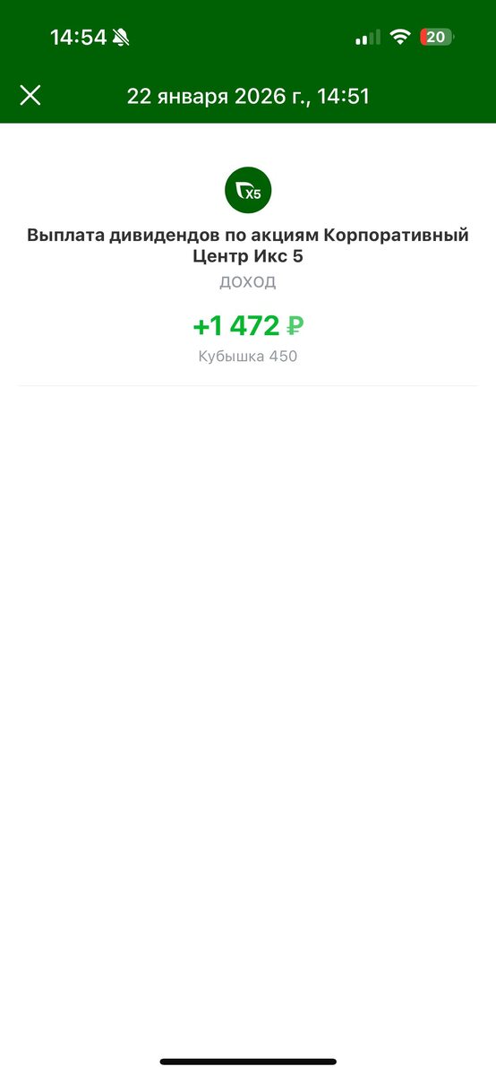 Дивиденды Х5 🍏 #1 Выплата : 1 472 ₽ После налога : 1 280 ₽ Вслед за Лукойлом пришли выплаты от Х5, немного существеннее. Ретейл выглядит в данное время стабильнее нефтяников, поэтому можно продолжать увеличивать позицию по Х5 групп. Да, высокие ставки. Да, имеется долг, но компания продолжает экспансию во всех регионах и на это требуется дополнительные затраты, которые окупятся в будущем. Наращивается кол-во магазинов и присутствие в дальних регионах. Далеко не факт, что следующие выплаты будут крупными, но выручка продолжает расти, как минимум на уровень инфляции. Люди всегда будут покупать продукты, а у этой компании есть магазины разного сегмента, что для меня является большим плюсом. Также поздравляю всех держателей акций, с пассивным доходом вас 😅 Подписаться: По рублю к миллиону