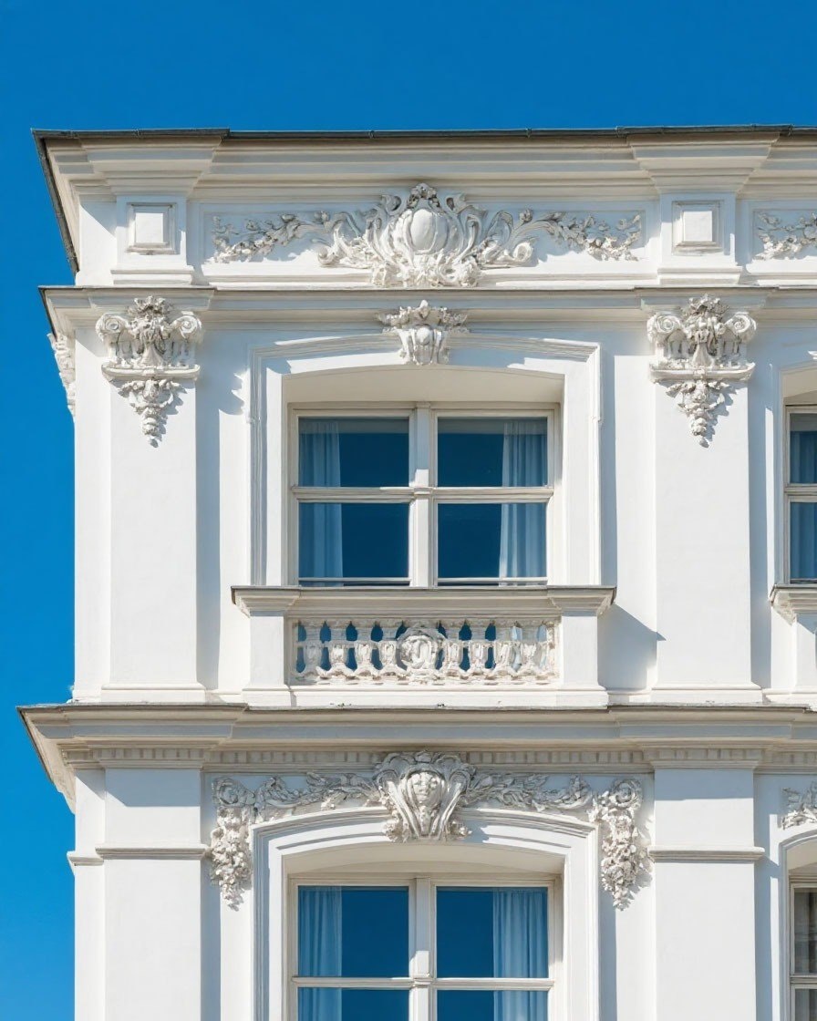 1. Прочность и климат. Стеклофибробетон выдерживает мороз, перепады температур, влагу и УФ-излучение. Он прочнее обычного бетона и подходит для любых климатических зон. 2. Вес и нагрузка на фасад. Материал лёгкий — в 2–3 раза легче классических бетонных элементов. Это снижает нагрузку на стены и ускоряет монтаж. 3. Возможность индивидуального дизайна. Стеклофибробетон позволяет создавать сложные формы, глубокий рельеф и крупные архитектурные элементы: карнизы, колонны, панели, лепнину. 4. Срок службы. При правильном монтаже и покраске прослужит 50+ лет. Не трескается, не крошится, не выгорает, хорошо сохраняет геометрию. 5. Монтаж и обслуживание. Элементы крепятся на подсистему или прямо к основанию — в зависимости от проекта. Уход минимальный: периодическое обновление краски.