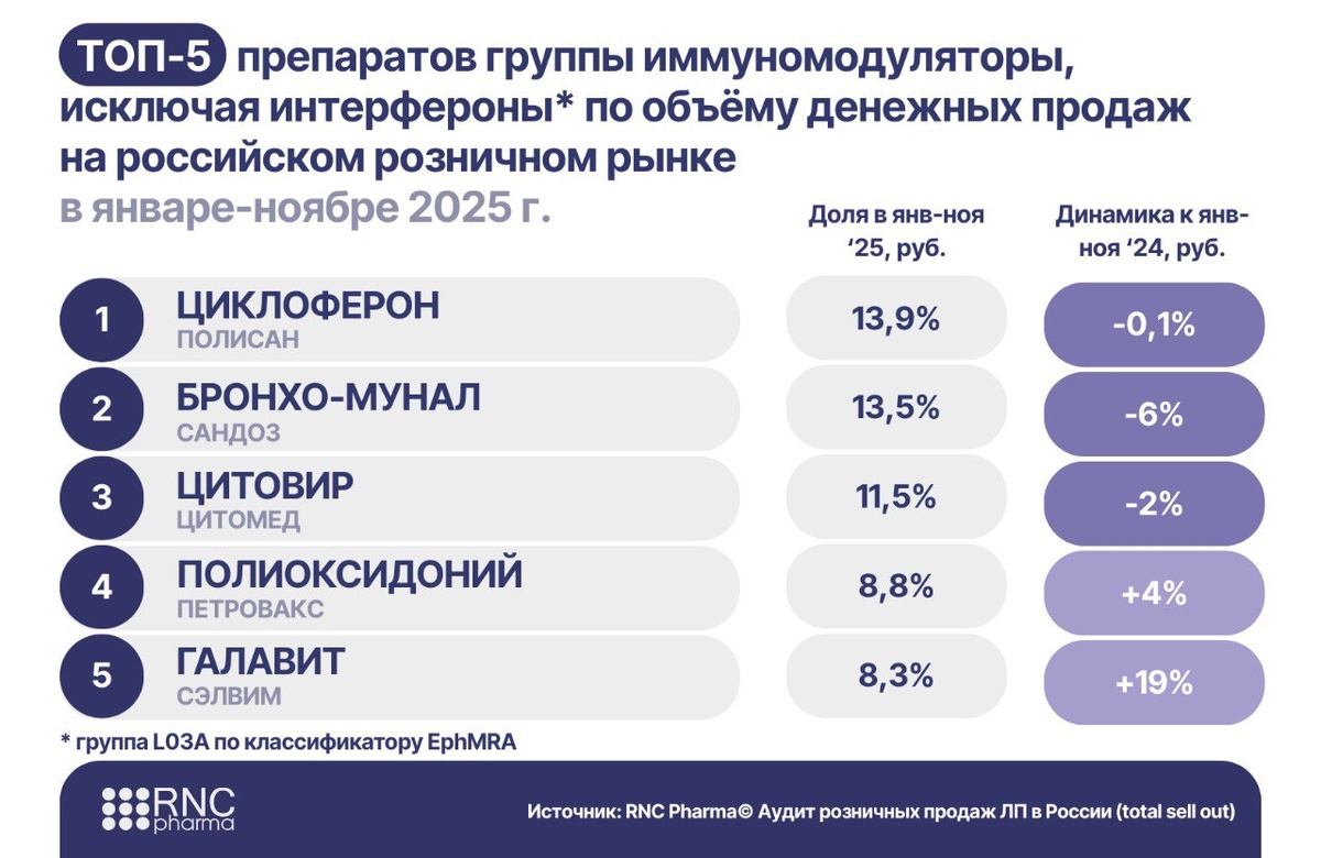 По данным RNC Pharma в январе-ноябре 2025 г.: 📈 17,9 млрд руб. составил розничный рынок иммуномодуляторов (L03A по по EphMRA), исключая интерфероны и колониестимулирующий фактор (+4,4% к янв-ноя ’24) 📈 22,8 млн упак. было реализовано (-6,1% к янв-ноя ’24). 📊 Натуральный спрос снижается уже не первый год: -3,4% в 2024 г., -7% в 2023 г. 🗂 50 торговых марок иммуномодуляторов от 56 корпораций представлено на рынке Динамика в ТОП-3 брендов 💊 #Циклоферон (#Полисан): -0,1% в руб. и -10,2% в упак. к янв-ноя ’24 💊 #БронхоМунал (#Sandoz): -5,5% в руб. и -7,2% в упак. к янв-ноя ’24 💊 #Цитовир (#Цитомед): -2% в руб. и -10,2% в упак. к янв-ноя ’24 #иммуномодуляторы #RNCPharma #Полиоксидоний #Галавит Источник: @RNCPharma Делитесь с коллегами и подписывайтесь на @pharmanalytica