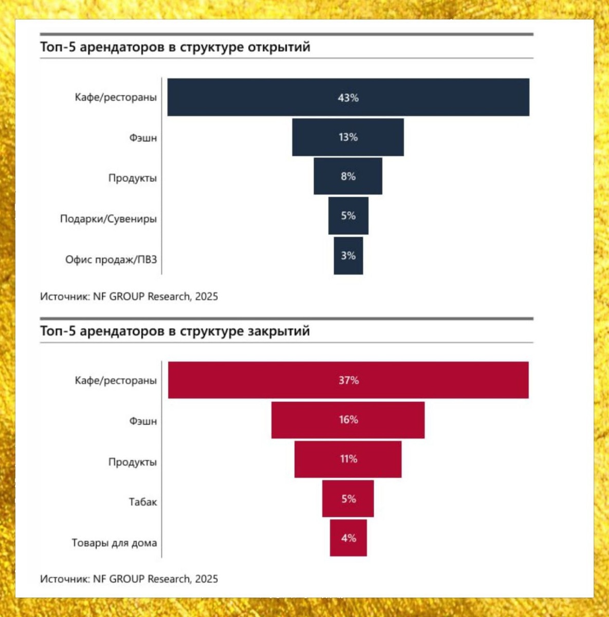 🖼 Картина отличается от московской: вакантность выросла до 7% (+1,4 процентных пункта за год), а закрытий стало на 35% больше, чем открытий. Рынок демонстрирует умеренную активность в ответ на сокращение потребительской активности. 📊 Общепит продолжает доминировать и занимает 41% всех площадей на центральных улицах (в Москве 38%). На пешеходных коридорах доля общепита достигает 62% - это рекордный показатель. Fashion держит второе место с 15%, продуктовые магазины - 9%. Интересно, что закрытия превысили открытия на 9%, что говорит о растущей чувствительности бизнеса к изменениям спроса. 🔄 Ротация усиливается избирательно. Количество открытий выросло на 15% и достигло 470 заведений, но закрытий стало 510. Наибольший рост закрытий - в косметических магазинах (в 5 раз), товарах для дома (более чем в 2 раза), табачных магазинах (в 2 раза). А вот ювелирные магазины показали рост открытий на 83%, сувениры и подарки - на 69%. 🗺 География вакантности неравномерна. На Невском проспекте (