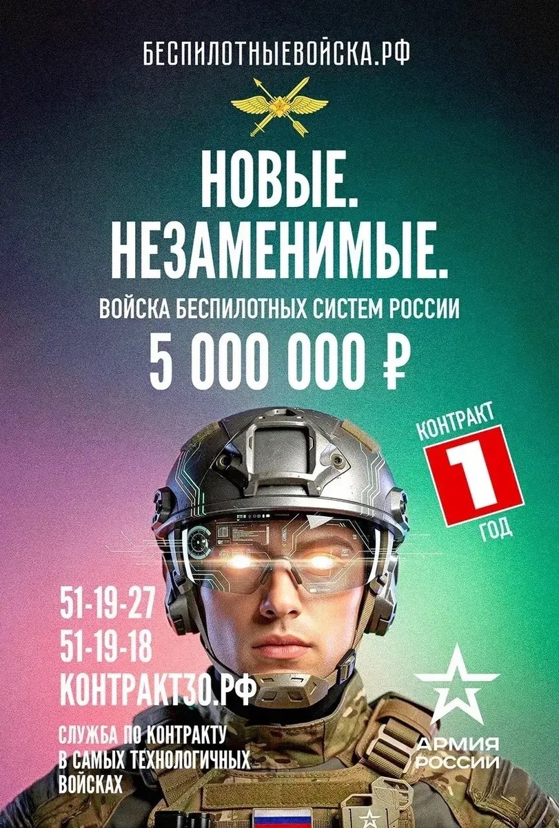 дронами. Напоминаем, продолжается отбор кандидатов на заключение контракта в подразделения войск беспилотных систем. Общая сумма выплат за год — до 5 млн. + бонусы за уничтоженную технику. Служба проходит только в частях БПЛА. Бойцы не участвуют в штурмовых действиях, находятся на большом расстоянии от линии фронта, управляя дронами из специализированных пунктов, а контракт заключается всего на год, и если военнослужащий не планирует его продлять, то увольнение гарантируется. За военнослужащим сохраняется место на работе и в учебном заведении. Участники СВО также получают соцподдержку: например, возможность поступления в вузы на бюджет вне конкурса, статус ветерана боевых действий и соответствующие льготы.