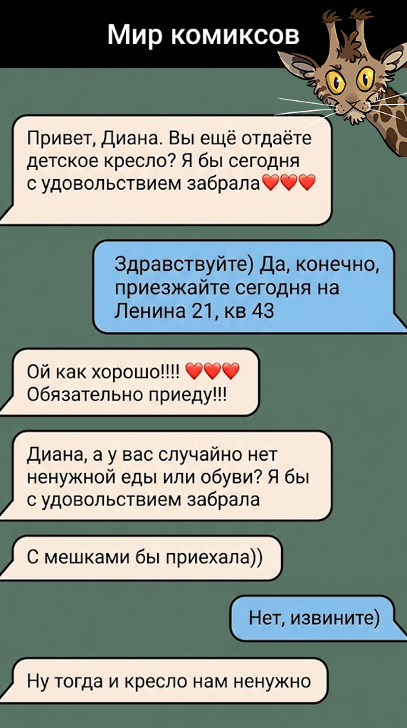 «Говорят, что слово — не воробей, но в эпоху скриншотов эта пословица звучит уже как угроза. Мы каждый день строчим сотни сообщений, даже не подозревая, что наш диалог может стать интернет-хитом и рассмешить тысячи людей. Канал «Мир комиксов» собрал 9 уморительных переписок, доказывающих, что человеческая логика — вещь непредсказуемая, а порой и беспощадная. Усаживайтесь поудобнее: перед вами хроники чужой наглости, гениального сарказма и нелепых ситуаций, в которых, к счастью, оказались не вы.» Иногда желание отдать даром ненужную вещь превращается в аттракцион неслыханной человеческой наглости. Существует особый тип «нуждающихся», для которых ваше доброе дело — это лишь повод проверить, насколько широко можно распахнуть дверь в вашу кладовую и холодильник. Существует мнение, что истинное отношение мужчины к браку проверяется не цветами на 8 Марта, а в моменты полного отключения сознания. Это просто поразительно, как одна удачная фраза, брошенная «на автопилоте», способна мгновенно