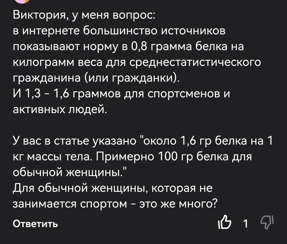 "Вика, откуда такие конские дозировки - 1,6 гр белка на 1 кг нормального веса?"