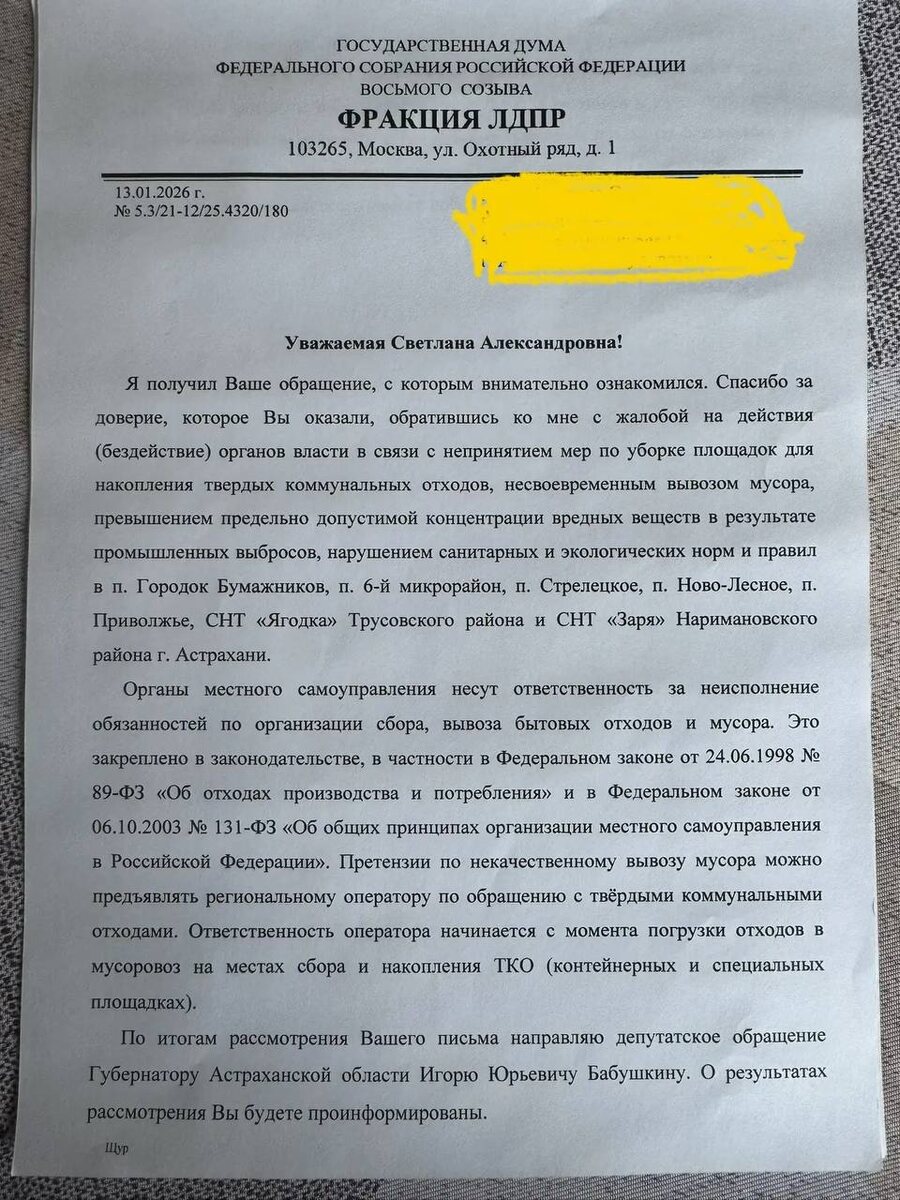 Поводом для этого стало сообщение, поступившее от координатора Трусовского первичного отделения ЛДПР Светланы Козновой. В свою очередь, Светлану Кознову попросили написать обращение на имя Леонида Слуцкого инициативная группа жителей Правобережья и Наримановского района, а именно: пос. Стрелецкий, 6-го микрорайона, пос. Новолесное, пос. Приволжье, СНТ «Ягодка» и «Заря». Астраханцы обеспокоены промышленными выбросами в воздух вредных веществ, а также нарушением санитарных норм. В частности, в пос. Стрелецком мусорная площадка «расползлась» практически по всему микрорайону. В официальном ответе Леонид Слуцкий пояснил, что «за неисполнение обязанностей по организации сбора, вывоза бытовых отходов несут ответственность органы местного самоуправления». ЛДПР будет следить за развитием событий.