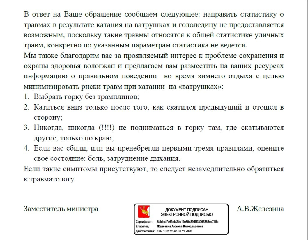 В прошлый раз ее не было у ЗАГСа, на этот раз – у областного Минздрава. «Речь» поинтересовалась, сколько обращений с начала года поступило в медучреждения Череповца, Вологды и в целом по региону по поводу травм, полученных в результате активного зимнего отдыха, особенно катания на «ватрушках». А также просили дать статистику по травматизму в результате гололедицы. Нам ответили, что такая статистика не ведется, и попросили разместить информацию, как избежать травм во время зимнего отдыха. Не проблема, размещаем вместе со всем ответом. Правда, и статистика уличных травм - а они по большей части и есть гололедные - никогда не была проблемой для врачей, они всегда предоставляли данные журналистам в ответ на наши обращения. Кадр из фильма «Служебный роман» (0+), «Мосфильм», 1977 г., реж. Эльдар Рязанов
