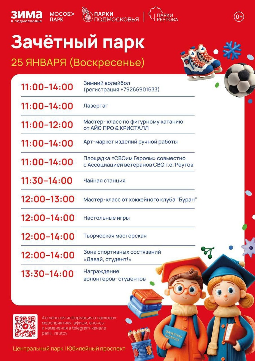 »! Подробности в афише. Приходите, будет интересно! 🎉 🏒 Обращаем внимание, что мастер-классы по фигурному катанию и хоккею пройдут на катке вокруг ёлки 🌟 Творческая мастерская, настольные игры и площадка «СВОим Героям» будут располагаться в арт-пространстве «За сценой» День студента – это замечательный повод встретиться, пообщаться и весело провести время! 🥳 До встречи в парке! #паркиреутова 💙«Мой Реутов» ВКонтакте: https://vk.ru/my_reutov