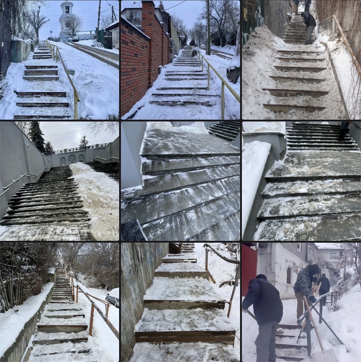 Вчера, после выпадения очередных осадков, работы по очистке и посыпке песко-соляной смесью нагорных лестниц велись на улицах Карла Маркса, Таранченко, Героев Революции, Герцена, Бехтерева, переулках Старомосковский и Бауманский, 25 Октября и др. Сегодня очистка продолжается еще на ряде улиц: Смоленской, Коммунаров и др.