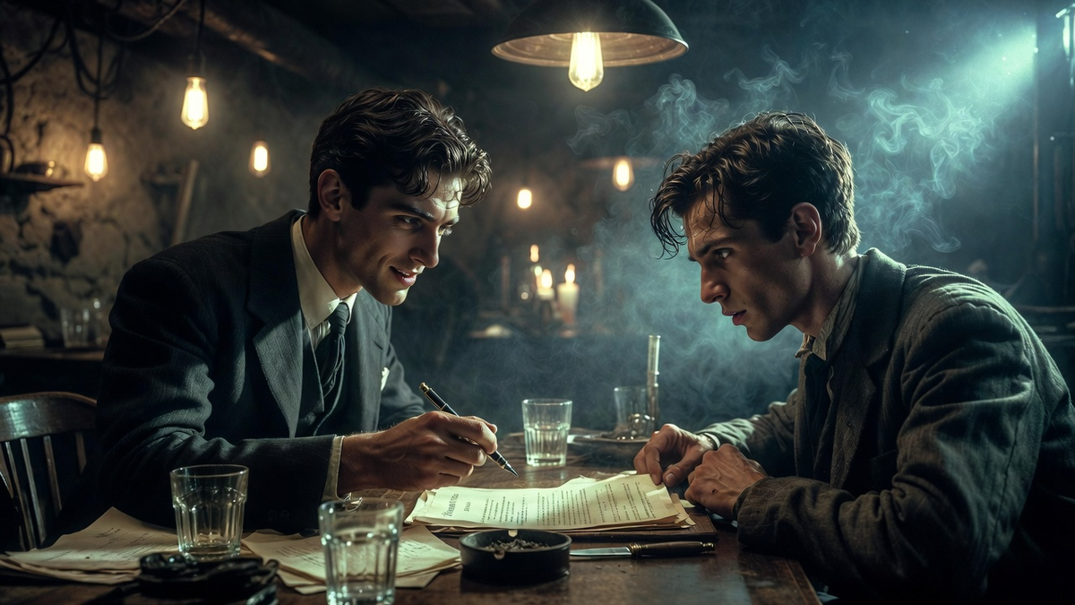 Леон, не раздумывая, повторил жест. Его кровь впилась в бумагу рядом с подписью, соединив их. В этот момент в подвал вошла официантка с подносом, и свет от двери упал на стол, осветив контракт. Леону показалось, что на мгновение буквы на странице зашевелились, как мелкие чёрные насекомые, но он списал это на игру света и тени, на голод и усталость.