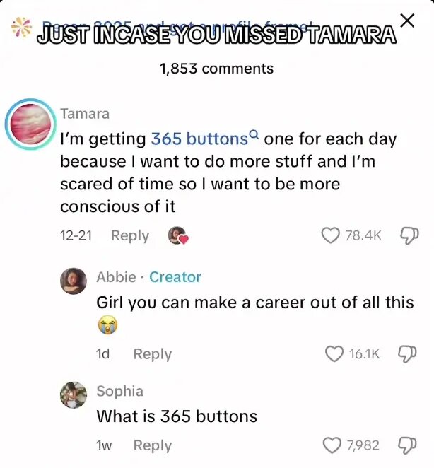 Лента TikTok заполнилась людьми, которые с серьезным видом перебирают пуговицы или ссыпают их в красивые банки. Со стороны это выглядит как массовый психоз или странный флешмоб кружка кройки и шитья. Но за этим нет ни сложной эзотерики, ни тайного заговора галантерейщиков. 365 пуговиц (365 buttons) — это первый вирусный тренд 2026 года, который случайно запустила одна девушка, пытаясь справиться с тревогой. Главное в этом меме — не фурнитура, а дерзкий ответ тем, кто привык искать во всём логику. Подробности в материале Postium. Читайте также: Как вести блог с помощью ИИ? Всё началось в TikTok на стыке 2025 и 2026 годов. Под видео о планах на новый год («rebrand 2026») пользовательница с ником Tamara (@flylikeadove) оставила комментарий о своём необычном ритуале. Она написала: «Я беру 365 пуговиц, по одной на каждый день, потому что хочу успеть больше. Я боюсь времени, поэтому хочу относиться к нему осознаннее». (в оригинале 365 buttons) Интернет, как обычно, потребовал отчета. Люди за