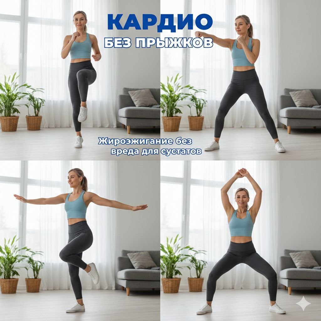 Кардио без прыжков = жиросжигание без вреда для суставов Эффективная тренировка не обязательно должна быть ударной. Если у вас большой вес, проблемы с коленями или нервные соседи снизу, низкоударное кардио - идеальный выбор. Плюс это минимальная нагрузка на суставы и позвоночник, можно заниматься дома даже без специальной обуви. 15-минут «Тихое кардио» 40 секунд работы/20 секунд отдыха. Поставьте перед собой часы или настройте таймер Табата в приложении. Это позволит держать пульс в зоне жиросжигания👍. Выполните 3 круга (при желании 5). Между кругами отдых — 1 минута. 1. Активный марш Шаг на месте, колени высоко, локти работают вдоль туловища. 2. Бокс в движении Широкая стойка, поочередные удары вперед + приставной шаг. 3. Захлесты голени Шаг в сторону — пятка к ягодице. Добавьте разведение рук. 4. Колено-локоть Стоя, соединяем противоположное колено и локоть перед собой. 5. Плие-приседания Широкие приседания, на подъеме вытягиваем руки вверх. 💡 Несколько советов для максима
