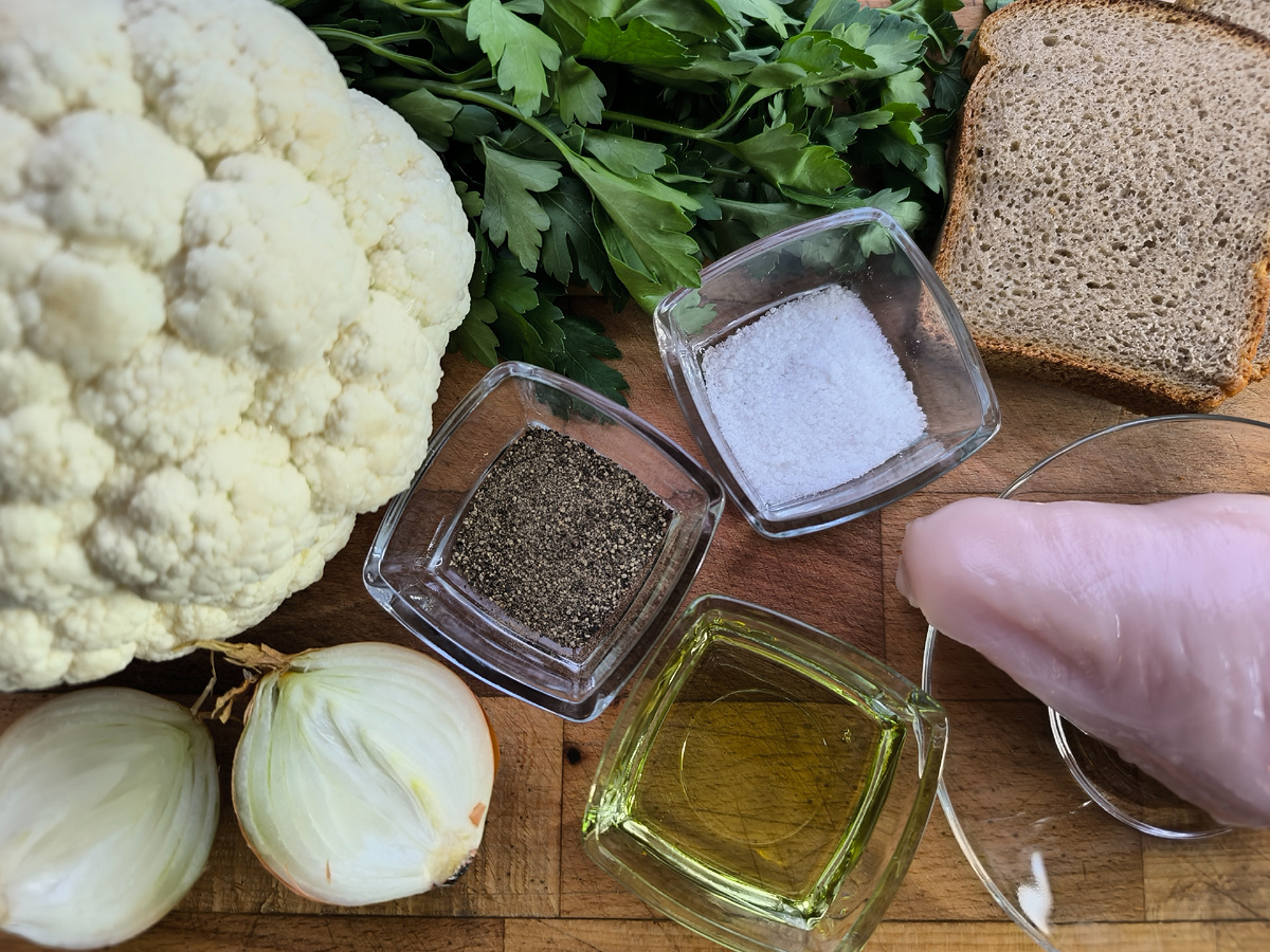 Но в этой статье расскажу об одном. Супы- пюре раньше как-то не очень часто готовила -- семья относится к ним равнодушно. А я люблю. И потом все практически рецепты супов-пюре позволяют значительно снизить калорийность и гликемический индекс в рецептуре за счёт минимального количества ингредиентов и упрощённой технологии приготовления. Итак, для приготовления супа-пюре нам понадобятся следующие продукты: красивый кочанчик цветной капусты (на самом деле для супа понадобится половина примерно, остальное используем для приготовления другого блюда), половинка куриной грудки (остальные два куска грудки в упаковке используем для другого блюда), примерно две-три ложки растительного масла, соль, перец по вкусу, петрушка, ржаные сухарики. Посуда и инвентарь: самое главное, что нам понадобится для приготовления супа -- измельчитель, дальше всё, как обычно: разделочная доска, поварской нож, мешочек для отходов, кастрюля суповая с крышкой, миска для смешивания супа, сито для процеживания бульона