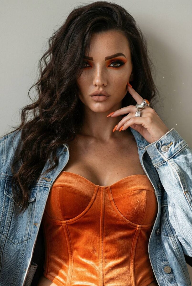 🔥🔥🔥🔥🔥🔥 Using the uploaded reference photo, keep facial features, bone structure, skin tone and hairstyle 100% identical to the original. Face: woman, dramatic smoky eye makeup оранжевого цвета,sharp eyeliner, matte nude lips with contour, intense stare, hyper-realistic skin with pores and fine details Outfit: Женщина в оранжевого цвета бархатном корсете, Структурированные корсетные швы, Вырез в форме сердца, Джинсовая оверсайз куртка из светлого денима , statement rings, luxury couture styling Чрезвычайно long wavy hair styled neatly, loose and voluminous,обьемные кудри закрывают часть глаз Pose: Reclined pose leaning back, head slightly forward, one hand lifted near face with long nails оранжевого цвета,bold provocative editorial attitude Background: Minimal neutral studio wall, clean and modern, subtle shadows Lighting: Hard editorial key light, crisp shadow edges, high contrast, sculpting face and suit, dust particles visible in beam Mood: Provocative power, sharp fashio