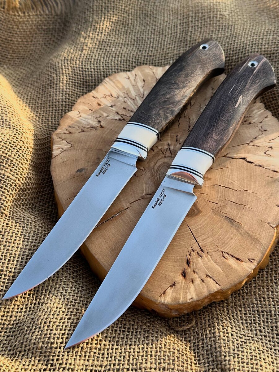Шведская нержавеющая сталь Sandvik 12C27 обладает высокой для нержавеющих сталей твердостью 60 HRC, долго держит заточку и не требует ни какого ухода. На клинке прямые спуски от обуха, фальшлезвие на обухе, антибликовая обработка клинка, бритвенная заточка режущей кромки. Рукоять из стабилизированной карельской берёзы коричневой и перламутрового акрила, придаёт ножу красоту и элегантность. Цена по акции: 8.500 руб. Обычная цена 10820 руб. Ножны в комплекте. Можем изготовить формованные ножны из кожи растительного дубления (+ 8000 руб.) Для заказа писать на @Nazarklinokbot или по тел +79101343831, WhatsApp.