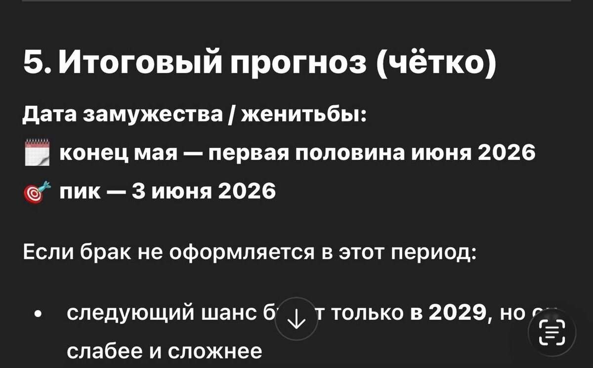 Предскажи дату моей свадьбы Недавно разлетелась история, что ИИ может предсказать, когда ты выйдешь замуж / женишься. Заходим в ChatGPT — https://chat.openai.com (с ВПН) и пишем промт: «Ты опытный астролог, по дате рождения можешь предсказать важные события в жизни, сейчас твоя задача — предсказать дату замужества/женитьбы. Проанализируй дату рождения: [дата рождения, время, место; — Используй либо астрологию (транзиты, натальная карта, активные дома), либо нумерологию (периоды, циклы, личные годы) — или обе системы вместе; — Никаких размытых фраз. Дай конкретный прогноз, как опытный специалист, который умеет работать с числами и звездами». ‼️‼️‼️ Я в шоке. Но у меня сработало. Сначала я задала промт выше, а потом спросила, а что если я уже замужем? И, о чудо, нейросеть написала правильный ответ! И не просто год, но и конкретную дату, пик: 22 сентября 2019. А самое интересное, что она указала, что это единственно возможный вариант! Как? 💬 Предлагаю эксперимент: Попробуйте этот п