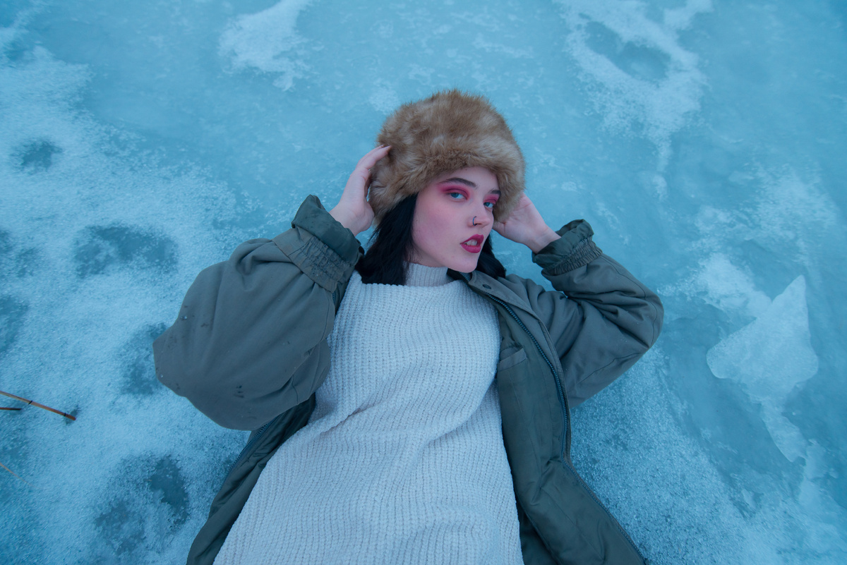 А Влада уже на льду пруда - моя любимая модель, терпеливая и с безумной творческой жилкой. С ней не страшно любые безумные идеи предлагать — она всегда «за», а ещё и свою крутую искру добавит. Вот и сейчас, в старой меховой шапке она выглядит так, будто это её родная стихия. Ей непонятно, почему я так переживаю. Иду. Каждый шаг — мысленное прощание с жизнью. Кто понимает, про что я?))) Лёд нормальный, кое-где снег подтаявший, моё воображение уже дописывает тревожный саундтрек. Начинаем снимать. Я трясусь, но не от холода. Влада — огонь. Она не ждёт указаний, она чувствует пространство. То присядет на льду, то