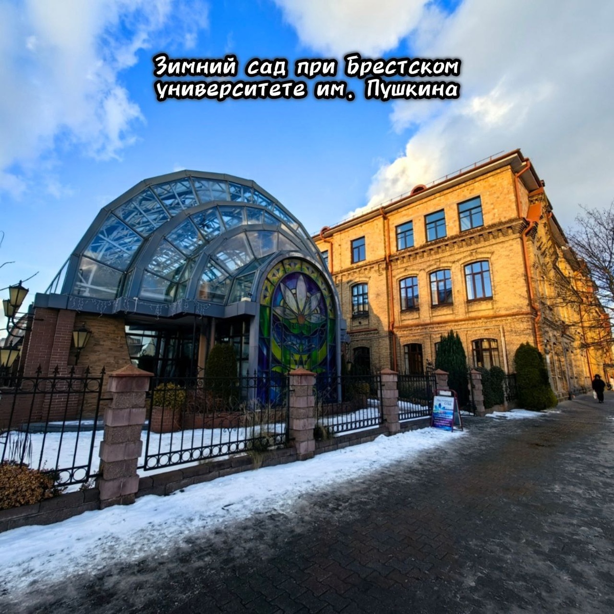 В Бресте я посетила необычное здание. Оно похоже на огромный стеклянный купол-парник. А на его фасаде красуется витраж в виде большого цветка. 🌸 🎓 Это Зимний сад при Брестском государственном университете имени Пушкина. Здесь оранжерея и лекторий под одной крышей. В окружении зелени студенты слушают пары. 🪻 Но тут можно узнать не только о биологии. На втором этаже я заметила таблички. На них описаны растения, которые используют для городских клумб и бордюров. 💬 А ещё эти таблички отсылают к "Саду непрерывного цветения". Он находится всего в 400 метрах отсюда у главного корпуса университета. И там тоже проходят занятия и экскурсии. #Брест #Беларусь