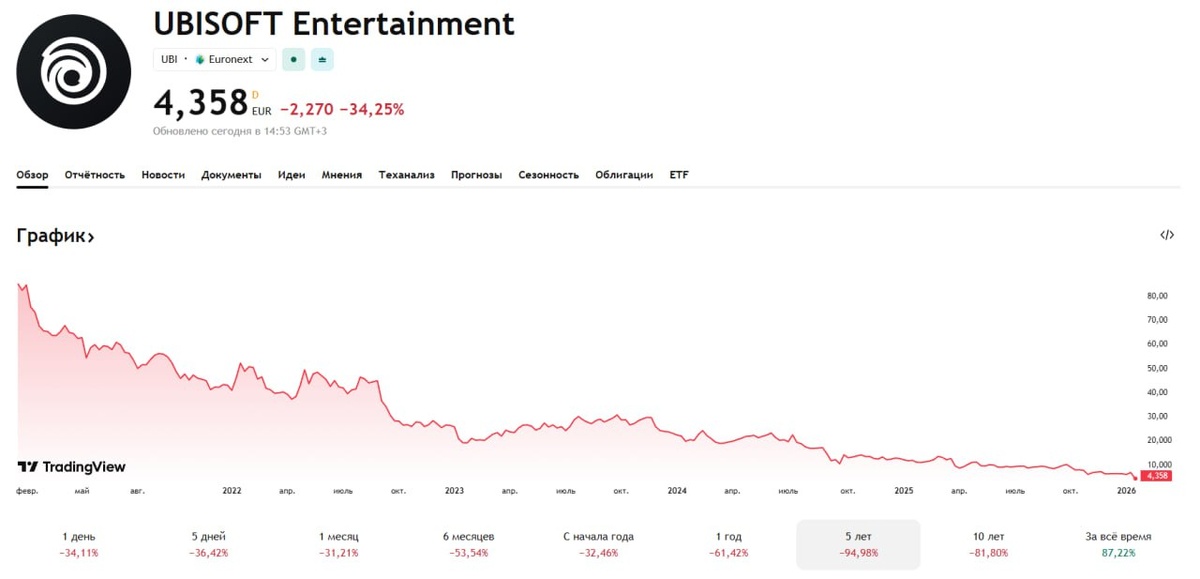 Акции Ubsoft обвалились до €4 за штуку. Вчера компания отменила сразу шесть игр и перенесла семь проектов. Следом стоимость ее акций моментально рухнула почти на 35% Всего 5 лет назад акции стоили €85. Сегодня рыночная капитализация опустилась к крайне низким уровням по историческим меркам, а убытки оцениваются в миллиарды евро. Теперь французы как никогда близки к банкротству...