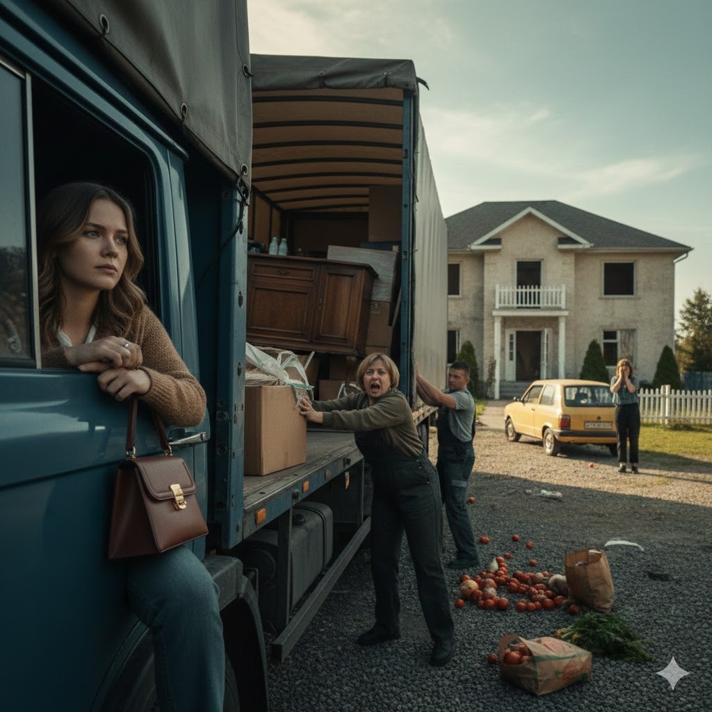 Грузовик взревел, выпуская облако сизого дыма. Антонина Павловна отпрыгнула в сторону, выкрикивая проклятия, но её голос быстро потонул в шуме мощного двигателя. Марина смотрела в зеркало заднего вида, как маленькая фигурка свекрови мечется среди рассыпанных овощей на фоне пустого, теперь уже по-настоящему чужого дома.