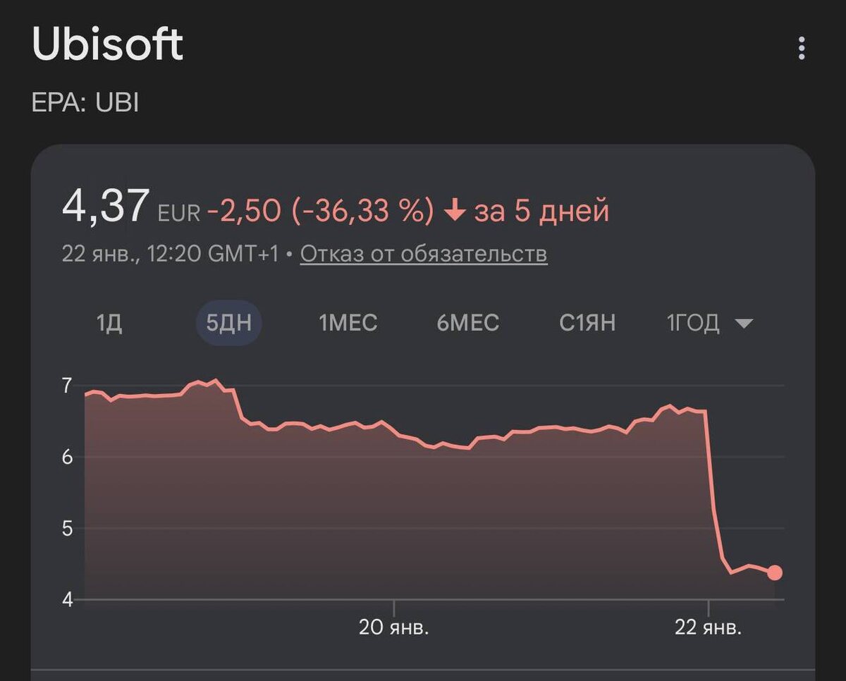 Акции Ubisoft за день упали почти на 40% после отмены и переноса релизов – это может стать худшим падением с 1996 года