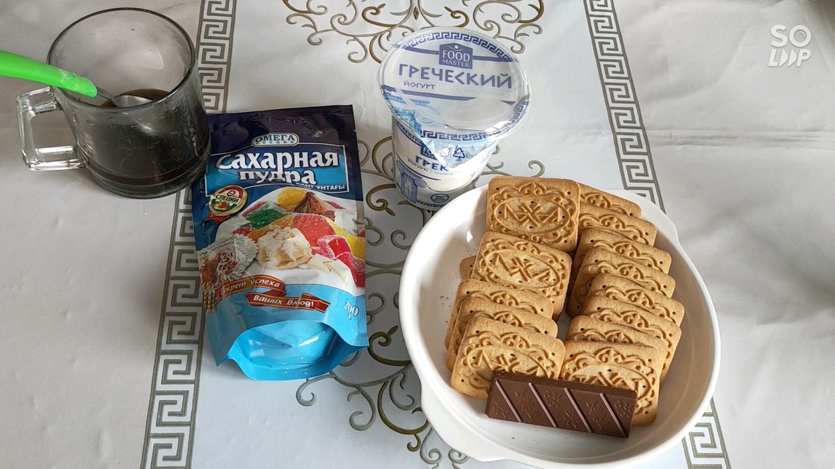 Этот десерт — идеальный баланс кремовой свежести, лёгкой сладости и бодрящей нотки кофе. Понадобится: 300 грамм греческого йогурта, 3 чайные ложки сахарной пудры, пакетик растворимого кофе, пачка печенья, 20 грамм шоколада.