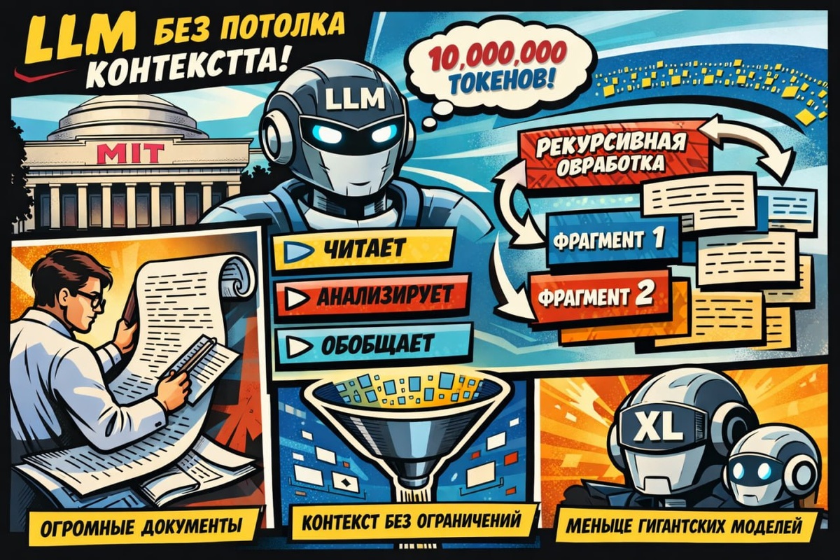 В MIT представили рекурсивный фреймворк, который позволяет языковым моделям работать с контекстами до 10 миллионов токенов — без радикального роста затрат памяти и вычислений. Звучит как очередной «хак», но на самом деле это это прикольная идея, изменить то, как модели читают и понимают большие объёмы данных. Ключевая идея проста: модель больше не пытается «держать всё в голове сразу». Вместо этого контекст разбивается на фрагменты, которые обрабатываются рекурсивно — с сохранением промежуточных представлений и повторным их использованием. По сути, это попытка приблизить LLM к человеческому способу работы с большими текстами: мы тоже читаем, обобщаем, возвращаемся и уточняем, а не помним всё слово в слово. Почему это важно: — Длинные документы (кодовые базы, логи, научные архивы) становятся реальным, а не маркетинговым сценарием. — Контекст перестаёт быть узким горлышком — фокус смещается с «сколько токенов» на «как организовано мышление модели». — Меньше зависимости от экстремально