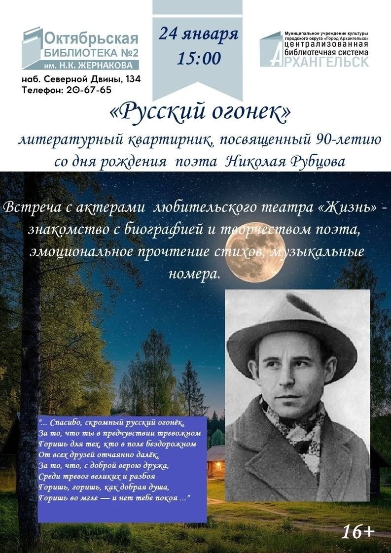 Н.К. Жернакова приглашает всех на литературный квартирник «Русский огонек», посвящённый жизни и творчеству замечательного русского поэта Николая Рубцова. Это замечательная возможность собраться в уютной обстановке, поделиться своими любимыми стихами. Программу подготовили артисты любительского театра "Жизнь" и студенты колледжа культуры. В их исполнении прозвучат стихи, песни, музыкальные номера. Режиссер Роман Абрамовский. Мероприятие состоится 24 января в 15:00 час. Вход свободный. https://vk.com/knibereg Адрес библиотеки: Набережная Северной Двины, 134. тел. 20-67-65. Самый #ПолезныйАрхангельск в MAX, в Telegram, в ВК