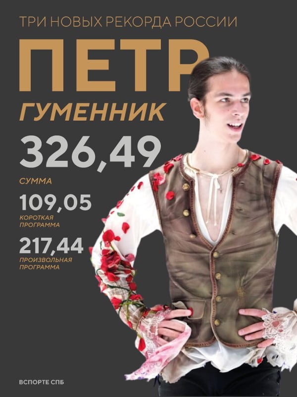 »! 🔝 Петербургский фигурист Пётр Гуменник обновил три рекорда России на Всероссийских соревнованиях памяти Петра Грушмана. ✔️ Короткая программа: 109,05 балла (предыдущий рекорд принадлежал петербуржцу Евгению Семененко, который он установил на Мемориале Панина-Коломенкина в 2024 году — 108,29 балла) ✔️ Произвольная программа: 217,44 балла ✔️ Сумма: 326,49 балла (предыдущие достижения также принадлежали Петру. На финале Гран-при 2025 года он заработал 210,04 балла в произвольной и 314,54 балла в сумме) Пётр так подвел итоги своего выступления: Доволен своим прокатом и баллами. Это была хорошая репетиция перед Олимпиадой. Теперь я последние две-три недели могу со спокойной душой успеть что-то еще улучшить, что получится. Как думаете, получится у нашего фигуриста завоевать медаль в Италии? 👍 - конечно, 100% 👎 - может не хватить опыта 🙌Будь ВСпорте!
