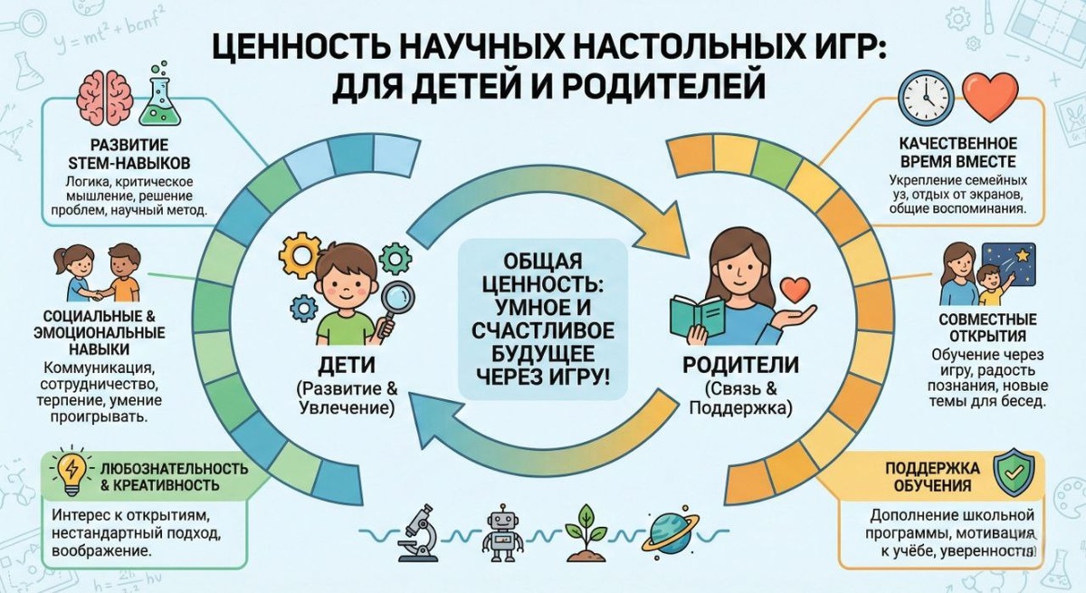 Но как сделать так, чтобы «полезно» не звучало как «скучно»? Ответ прост: научные настольные игры. Это не просто бросание кубиков, а настоящий тренажер для будущего гения и мостик к доверию в семье. Играя, ребенок незаметно для себя осваивает серьезные вещи. Во-первых, это мощное развитие STEM-навыков: включается логика, критическое мышление и научный подход к решению задач. Во-вторых, это тренировка характера. Дети учатся общаться, договариваться, терпеливо ждать своего хода и — что очень важно — достойно проигрывать. Плюс ко всему, такие игры пробуждают любознательность и креативность, показывая, что наука — это захватывающее приключение. Для нас, взрослых, ценность таких игр не меньше. Это то самое «качественное время» вместе: без телефонов, без суеты, только живое общение и укрепление семейных уз. Вы совершаете открытия вместе с ребенком, находите новые темы для бесед и становитесь одной командой. К тому же, это отличная поддержка школьного обучения — сложные темы из учебник