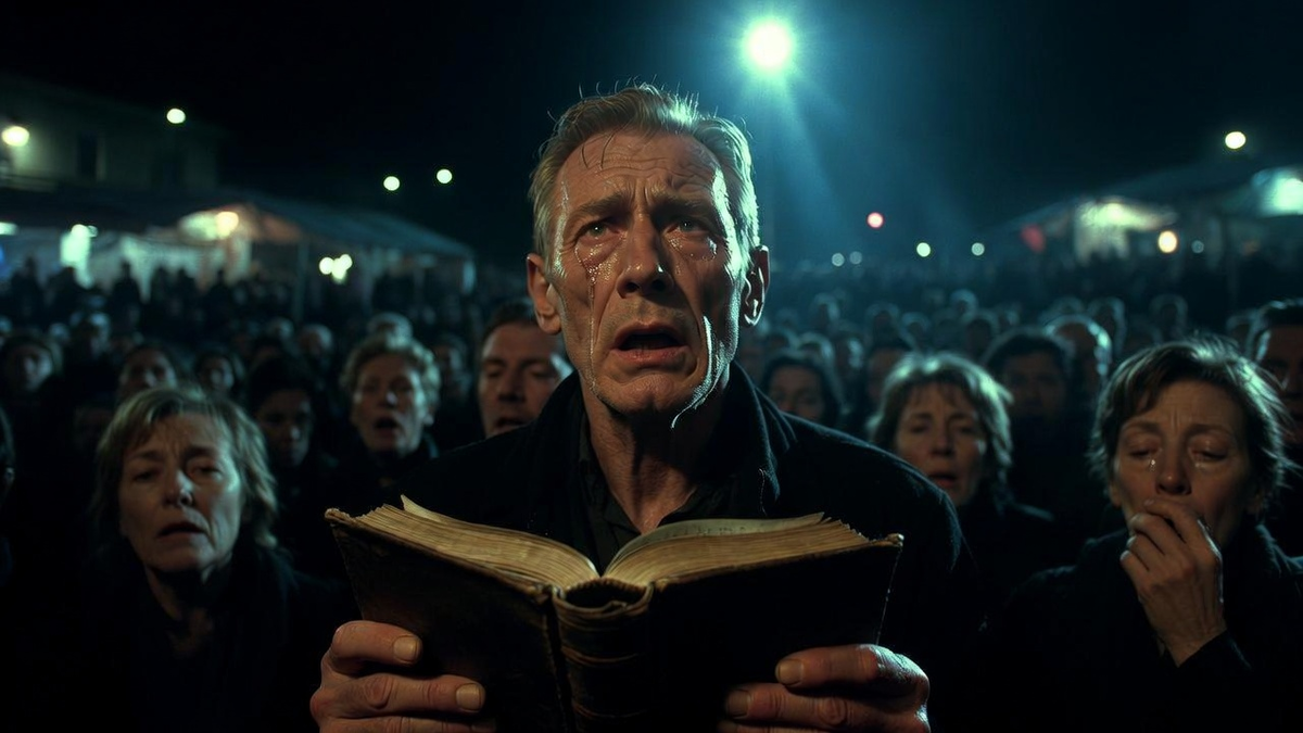 Леонид дошёл до середины сцены, остановился. Он не смотрел на людей. Он смотрел куда-то поверх их голов, в тёмнеющее небо, где зажигались первые звёзды. Фонарь, укреплённый на шесте, бросал жёсткий свет на его морщинистое, аскетичное лицо.